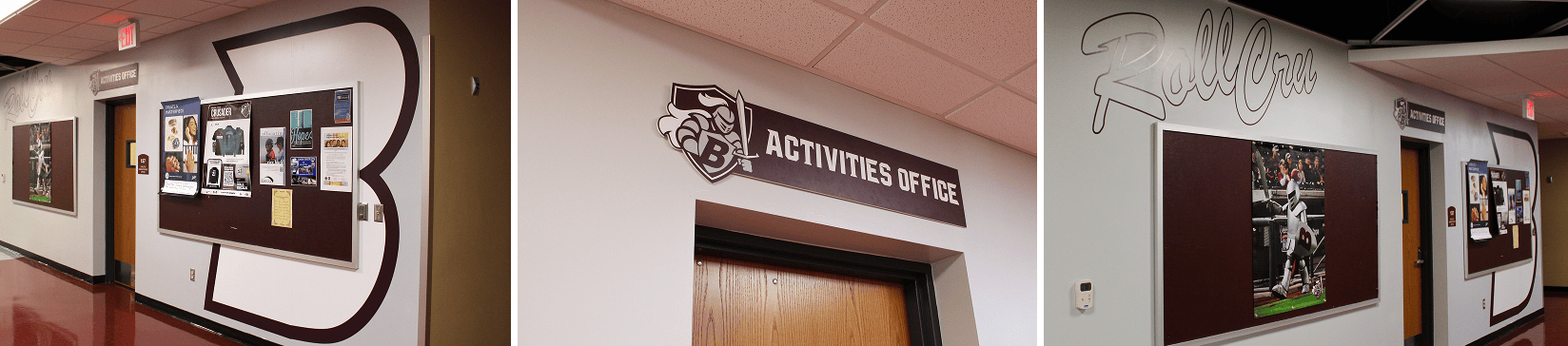 To create a cohesive look across all athletic facilities and boost team spirit, we also refreshed the area outside the athletic offices, located adjacent to the school’s second indoor gym. This phase of the project focused on clean, high-impact branding, including two large vinyl wall decals featuring the school tagline and “B” icon. These were printed on 3M IJ180cv3 with 3M 8520 Matte Laminate, resulting in a smooth finish that would also help prevent scuffs . along with a rigid PVC sign mounted above the athletic office. The result clearly identifies the athletics department while reinforcing the school’s brand and making it easy for visitors and students to find the information they need.